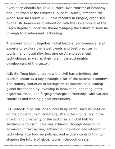 6/3/25, 10:26 AM  H.E. Bin Touq participates in World Tourism Forum in Prague and highlights UAE's leadership in promoting sustainable tourism thro…