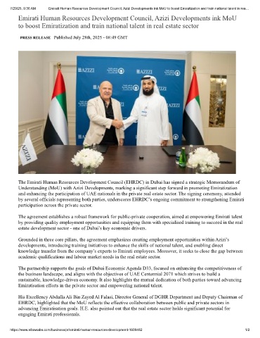7/29/25, 9:36 AM Emirati Human Resources Development Council, Azizi Developments ink MoU to boost Emiratization and train national talent in rea…