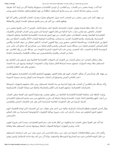 ﺎﻬﻧأ ﺪﻛأ ﻲﺘﻟاو ،ﻲﺗارﺎﻣإلا بﺎﺒﺸﻟا تارﺪﻗو تاﺮﺒﺨﺑ ،ﺢﻟاﻮﺼﻟا ناوﺮﻣ ﺪﻤﺣأ ،بﺎﺒﺸﻠﻟ ﻲﺑد ﺲﻠﺠﻣ ﺲﻴﺋر ﺐﺋﺎﻧ دﺎﺷأ ،ﻪﺘﻬﺟ ﻦﻣ