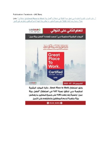 Publication: Facebook – UAE Barq Link: " علاطتسا قفوGreat Place to Work ةئيب لضفأ" علاطتسا يف %97 ةبسن ققحت يبد ةموكحل ةيرشبلا دراوملا ةرئاد .." .زيمتلا ىلع مهزفحتو نيفظوملا معدت ةمهلم ةئيب سكعي ام ،ريياعملا عيمج ىلع %90 تغلب اضر ةبسنو ،"لمع