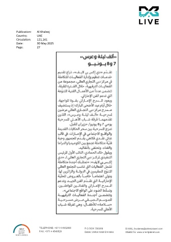 Publication: Al Khaleej Country: UAE Circulation: 121,141 Date: 30 May 2025 Page: 27 TELEPHONE: +971 4 4562888 P.O.BOX: 500266 E-MAIL: business@orientplanet.com FAX: +971 4 4549528 Dubai, United Arab Emirates WEBSITE: www.orientplanet.com