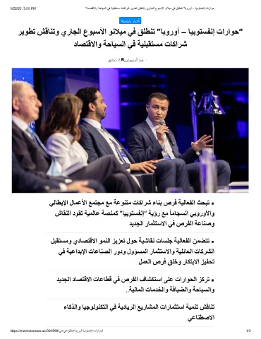 5/22/25, 3:55 PM "دﺎﺻﺗﻗﻻاو ﺔﺣﺎﯾﺳﻟا ﻲﻓ ﺔﯾﻠﺑﻘﺗﺳﻣ تﺎﻛارﺷ رﯾوطﺗ شﻗﺎﻧﺗو يرﺎﺟﻟا عوﺑﺳﻷا وﻧﻼﯾﻣ ﻲﻓ ﻖﻠطﻧﺗ "ﺎﺑوروأ – ﺎﯾﺑوﺗﺳﻔﻧإ تاراوﺣ
