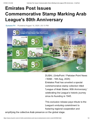 8/19/25, 9:52 AM Emirates Post Issues Commemorative Stamp Marking Arab Leagues 80th Anniversary - UrduPoint