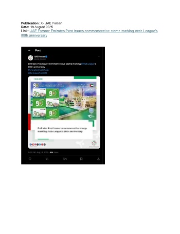 Publication: X- UAE Forsan Date: 19 August 2025 Link: UAE Forsan: Emirates Post issues commemorative stamp marking Arab League's 80th anniversary