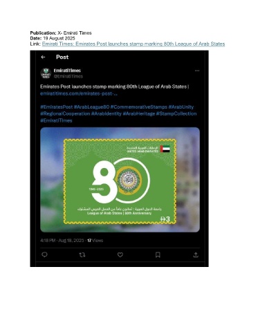 Publication: X- Emirati Times Date: 19 August 2025 Link: Emirati Times: Emirates Post launches stamp marking 80th League of Arab States