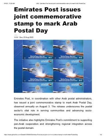 8/4/25, 10:28 AM UAE: Emirates Post issues joint commemorative stamp to mark Arab Postal Day