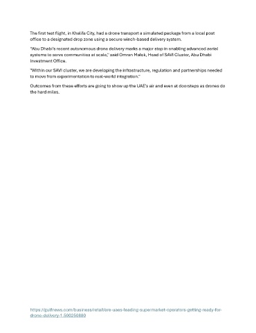 The first test flight, in Khalifa City, had a drone transport a simulated package from a local post