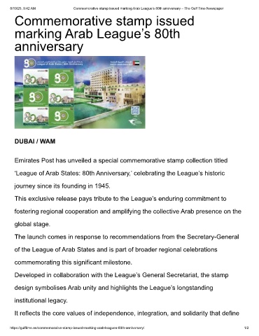 https://gulftime.ae/commemorative-stamp-issued-marking-arab-leagues-80th-anniversary/ 1/2
