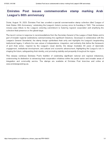 8/19/25, 9:46 AM Emirates Post issues commemorative stamp marking Arab League's 80th anniversary