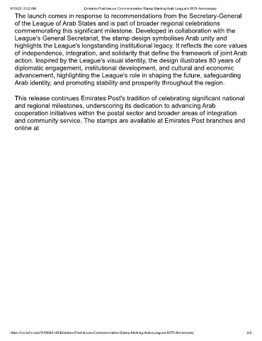 8/19/25, 9:52 AM Emirates Post Issues Commemorative Stamp Marking Arab League's 80Th Anniversary