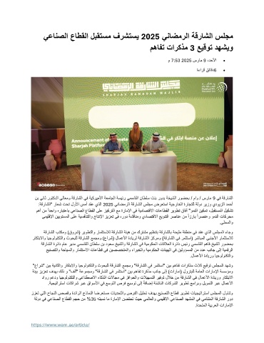 "عارش" نيب ةيناثلاو راكتبلااو ايجولونكتلاو ثوحبلل ةقراشلا عمجمو "ةقراشلا يف رمثتسا" نيب مهافت تاركذم ثلاث عيقوت سلجملا دهشو