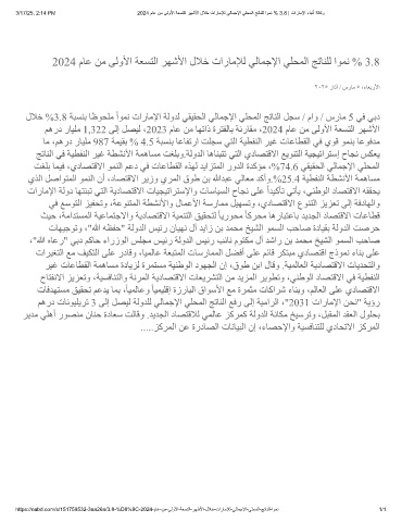 3/17/25, 2:14 PM 2024 مﺎﻋ نﻣ ﻰﻟوﻷا ﺔﻌﺳﺗﻟا رﮭﺷﻷا لﻼﺧ تارﺎﻣﻺﻟ ﻲﻟﺎﻣﺟﻹا ﻲﻠﺣﻣﻟا ﺞﺗﺎﻧﻠﻟ اوﻣﻧ % 3.8 | تارﺎﻣﻹا ءﺎﺑﻧأ ﺔﻟﺎﻛو