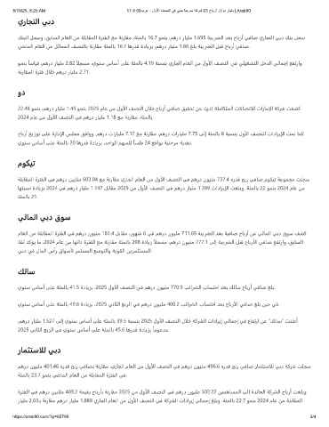 22.48 ﻮﻤﻨﺑ ،ﻢﻫرد رﺎﻴﻠﻣ 1.45 ﻮﺤﻨﺑ 2025 مﺎﻋ ﻦﻣ لوألا ﻒﺼﻨﻟا لالﺧ حﺎﺑرأ ﻲﻓﺎﺻ ﻖﻴﻘﺤﺗ ﻦﻋ ،(ود) ﺔﻠﻣﺎﻜﺘﻤﻟا تالﺎﺼﺗالﻟ تارﺎﻣإلا ﺔﻛرش ﺖﻔﺸﻛ