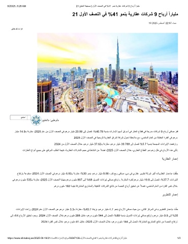 رﺎﯾﻠﻣ 14.9ـﺑ ﺔﻧرﺎﻘﻣ ،2025 مﺎﻋ نﻣ لوﻷا فﺻﻧﻟا ﻲﻓ مھرد رﺎﯾﻠﻣ 20.98 ﻰﻟإ لﺻﺗﻟ ،%40.78 ﺔﺑﺳﻧﺑ تارﺎﻣﻹا مﮭﺳأ قاوﺳأ ﻲﻓ رﺎﻘﻌﻟا عﺎطﻗ ﻲﻓ ﺔﺟردﻣ تﺎﻛرﺷ 9 حﺎﺑرأ ﻲﻓﺎﺻ زﻔﻗ