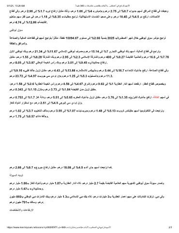 ﺔﻋﺎﻧﺻﻟاو ﺔﯾﻟﺎﻣﻟا تﺎﻋﺎطﻗ ﻲﻓ مﮭﺳأ ﻊﺟارﺗﺑ ًارﺛﺄﺗﻣ ،ﺔطﻘﻧ 10094.67 ىوﺗﺳﻣ ﻰﻟإ %2.66 ﺔﺑﺳﻧﺑ 2025 بآ/سطﺳﻏأ رﮭﺷ لﻼﺧ ﻲﺑظوﺑأ قوﺳ رﺷؤﻣ ﻊﺟارﺗ