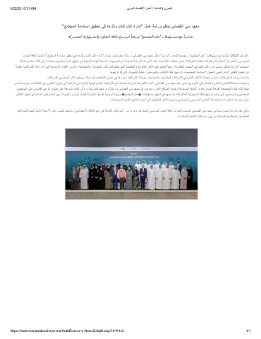 نوﺎﻌﺗﻟا ﺔﻓﺎﻘﺛ زﯾزﻌﺗﻟ ،"ﻊﻣﺗﺟﻣﻟا ﺔﻣادﺗﺳا ﻖﯾﻘﺣﺗ ﻲﻓ ﺎھرﺛأو تﺎﻛارﺷﻟا ةرادإ" ناوﻧﻋ تﺣﺗ ٍلﻣﻋ ﺔﺷرو ،ﻲﺋﺎﺿﻘﻟا ﻲﺑد دﮭﻌﻣ م ﱠ ظﻧ ،"دﯾﺑ ًادﯾ" هرﺎﻌﺷﻟ ًادﯾﺳﺟﺗو ،"ﻊﻣﺗﺟﻣﻟا مﺎﻋ" تﺎﻓدﮭﺗﺳﻣ ﻊﻣ ً ﺎﯾﺷﺎﻣﺗ :2025 وﯾﺎﻣ 21
