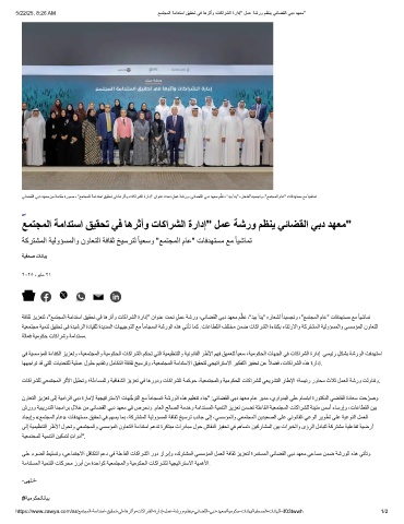ﺔﻓﺎﻘﺛ زﯾزﻌﺗﻟ ،"ﻊﻣﺗﺟﻣﻟا ﺔﻣادﺗﺳا ﻖﯾﻘﺣﺗ ﻲﻓ ﺎھرﺛأو تﺎﻛارﺷﻟا ةرادإ" ناوﻧﻋ تﺣﺗ ٍلﻣﻋ ﺔﺷرو ،ﻲﺋﺎﺿﻘﻟا ﻲﺑد دﮭﻌﻣ م ﱠ ظﻧ ،"دﯾﺑ ًادﯾ" هرﺎﻌﺷﻟ ًادﯾﺳﺟﺗو ،"ﻊﻣﺗﺟﻣﻟا مﺎﻋ" تﺎﻓدﮭﺗﺳﻣ ﻊﻣ ً ﺎﯾﺷﺎﻣﺗ