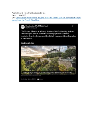 Publication: X – Construction Week Online Date: 11 July 2025 Link: Construction Week Online: Insights: What the Middle East can learn about ‘smart’ spaces from the French City of Pau