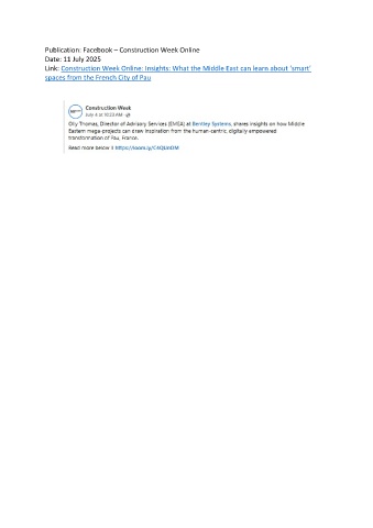 Publication: Facebook – Construction Week Online Date: 11 July 2025 Link: Construction Week Online: Insights: What the Middle East can learn about ‘smart’ spaces from the French City of Pau