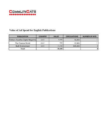 Value of Ad Spend for English Publications PUBLICATION COUNTRY VALUE CIRCULATIONS NUMBER OF HITS Robban Assafina Digital Magazine GCC 6,600 16,000 1 The Finance World GCC 900 12,900 1 Built Environment GCC 13,100 545,400 2 Total 20,600 4