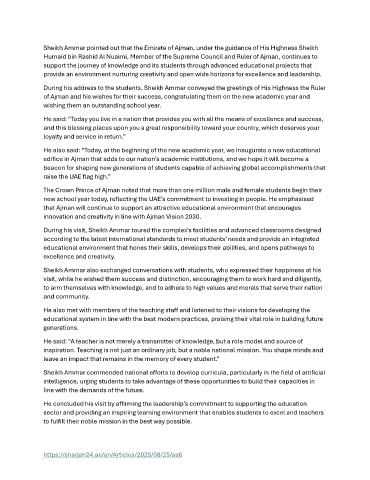 During his address to the students, Sheikh Ammar conveyed the greetings of His Highness the Ruler