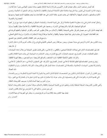 ﺔﯿﻟﺎﺤﻟا تﺎﻌﯾﺮﺸﺘﻟﺎﺑ ﻞﻤﻌﻟا راﺮﻤﺘﺳا ًاﺪﻛﺆﻣ ،مﻼﻋﻹاو ﺔﻓﺎﻘﺜﻟاو ﺔﯿﺣﺎﯿﺴﻟا ﺔﯿﻤﻨﺘﻟا ﻲﺗﺮﺋاد ﻢﯿﻈﻨﺗو ءﺎﺸﻧﺈﺑ ﺔﻘﻠﻌﺘﻤﻟا ﺔﻘﺑﺎﺴﻟا تﺎﻌﯾﺮﺸﺘﻟا نﻮﻧﺎﻘﻟا ﻰﻐﻟأو