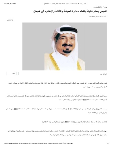 8/27/25, 1:32 PM ﺞﯾﻠﺧﻟا ﺔﻔﯾﺣﺻ | نﺎﻣﺟﻋ ﻲﻓ «مﻼﻋﻹاو ﺔﻓﺎﻘﺛﻟاو ﺔﺣﺎﯾﺳﻟا ةرﺋاد» ءﺎﺷﻧﺈﺑ ً ﺎﻧوﻧﺎﻗ ردﺻﯾ ﻲﻣﯾﻌﻧﻟا