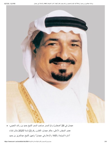 8/27/25, 1:25 PM نﺎﻣﺟﻋ ﻲﻓ "مﻼﻋﻹاو ﺔﻓﺎﻘﺛﻟاو ﺔﺣﺎﯾﺳﻟا ةرﺋاد" ءﺎﺷﻧﺈﺑ ً ﺎﻧوﻧﺎﻗ ردﺻﯾ دﺷار نﺑ دﯾﻣﺣ تارﺎﻣﻹا ءﺎﺑﻧأ ﺔﻟﺎﻛو | دﯾﻣﺣ نﺑ زﯾزﻌﻟادﺑﻋ ﺔﺳﺎﺋرﺑ