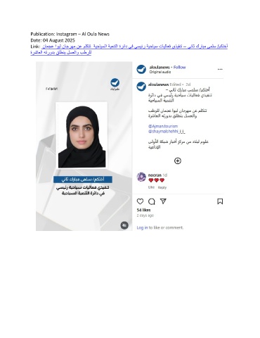 Publication: Instagram – Al Oula News Date: 04 August 2025 Link: نامجع اويل ناجرهم نع ملكتت ةيحايسلا ةيمنتلا ةرئاد يف يسيئر ةيحايس تايلاعف يذيفنت – يناث كرابم ىملس /مكتخأ ةرشاعلا هترودب قلطني لسعلاو بطرلل