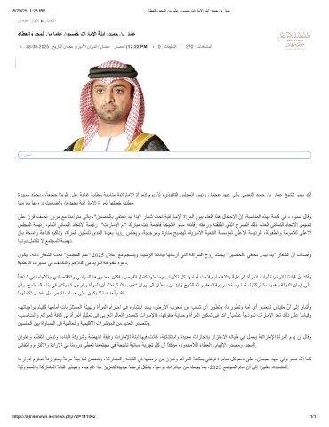 ةﺮﯿﺴﻣ ﺪّﺴﺠﯾو ، ً ﺎﻌﯿﻤﺟ ﺎﻨﺑﻮﻠﻗ ﻰﻠﻋ ﺔﯿﻟﺎﻏ ﺔﯿﻨطو ﺔﺒﺳﺎﻨﻣ ﺔﯿﺗارﺎﻣﻹا ةأﺮﻤﻟا مﻮﯾ ّنأ ،يﺬﯿﻔﻨﺘﻟا ﺲﻠﺠﻤﻟا ﺲﯿﺋر نﺎﻤﺠﻋ ﺪﮭﻋ ﻲﻟو ﻲﻤﯿﻌﻨﻟا ﺪﯿﻤﺣ ﻦﺑ رﺎﻤﻋ ﺦﯿﺸﻟا ﻮﻤﺳ ﺪﻛأ