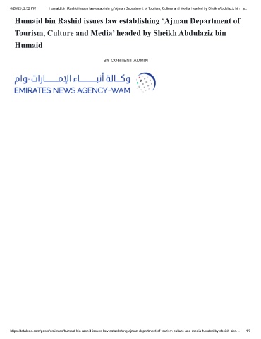 8/28/25, 2:32 PM Humaid bin Rashid issues law establishing ‘Ajman Department of Tourism, Culture and Media’ headed by Sheikh Abdulaziz bin Hu…