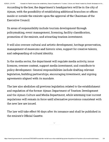 8/28/25, 2:34 PM Humaid bin Rashid issues law establishing 'Ajman Department of Tourism, Culture and Media' headed by Sheikh Abdulaziz bin Hu…