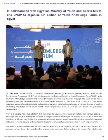7/16/25, 9:40 AM  In collaboration with Egyptian Ministry of Youth and Sports MBRF and UNDP to organise 4th edition of Youth Knowledge Forum in …