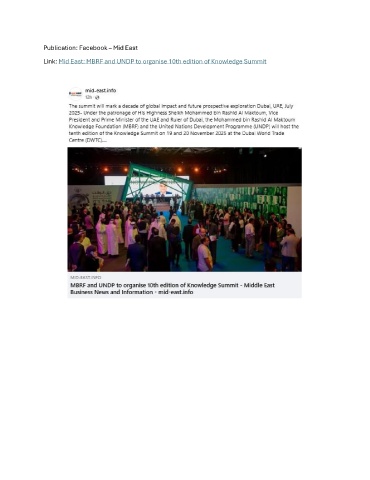 Publication: Facebook – Mid East Link: Mid East: MBRF and UNDP to organise 10th edition of Knowledge Summit