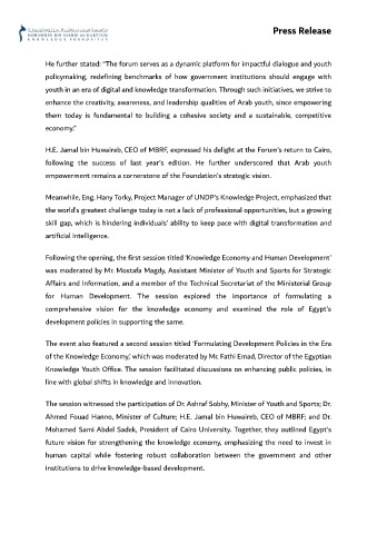H.E. Jamal bin Huwaireb, CEO of MBRF, expressed his delight at the Forum’s return to Cairo,
