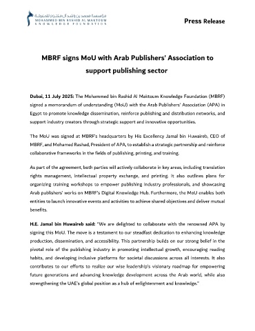 Arab publishers’ works on MBRF’s Digital Knowledge Hub. Furthermore, the MoU enables both