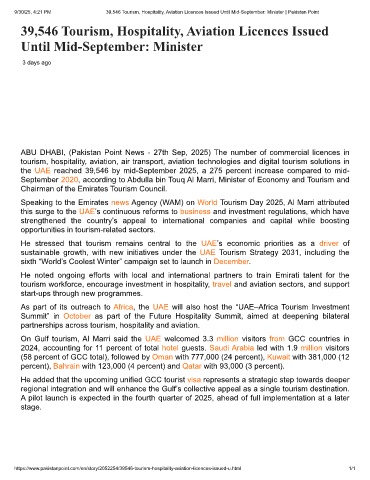 Speaking to the Emirates news Agency (WAM) on World Tourism Day 2025, Al Marri attributed