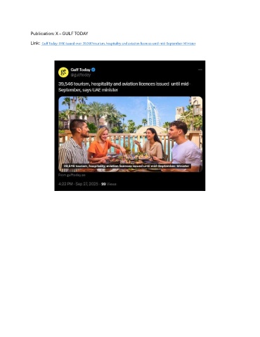 Publication: X – GULF TODAY Link: Gulf Today: UAE issued over 39,500 tourism, hospitality and aviation licences until mid-September: Minister