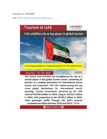 Publication: X – UAE BARQ Link: UAE Barq: UAE solidifies role as key player in global tourism