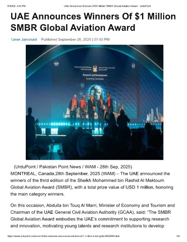 9/30/25, 4:45 PM UAE Announces Winners Of $1 Million SMBR Global Aviation Award - UrduPoint