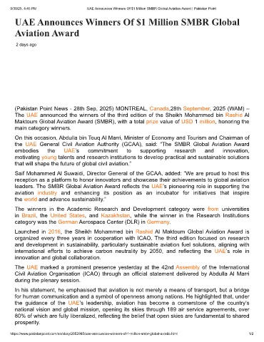 9/30/25, 4:45 PM UAE Announces Winners Of $1 Million SMBR Global Aviation Award | Pakistan Point