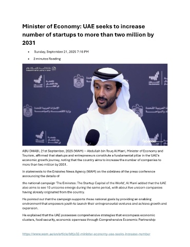ABU DHABI, 21st September, 2025 (WAM) -- Abdullah bin Touq Al Marri, Minister of Economy and
