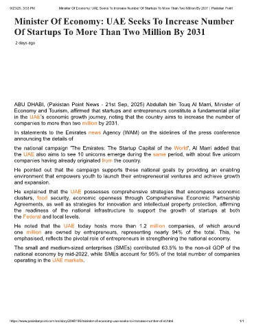9/23/25, 3:53 PM Minister Of Economy: UAE Seeks To Increase Number Of Startups To More Than Two Million By 2031 | Pakistan Point
