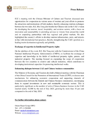 between the two sides. H.E. Bin Touq also briefed the Chinese side on the UAE’s vision