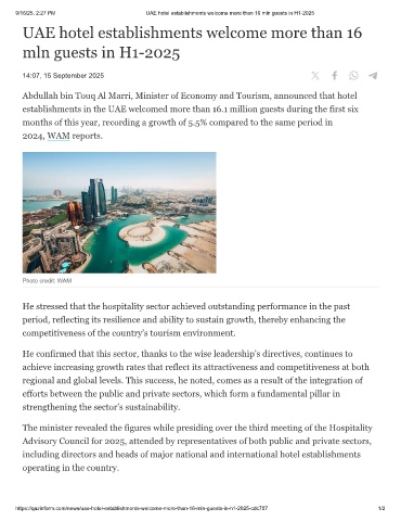 9/16/25, 2:27 PM UAE hotel establishments welcome more than 16 mln guests in H1-2025
