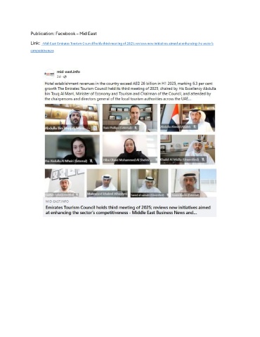 Publication: Facebook – Mid East Link: -Mid-East: Emirates Tourism Council holds third meeting of 2025; reviews new initiatives aimed at enhancing the sector’s competitiveness