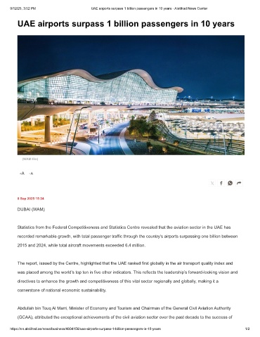 9/12/25, 3:52 PM UAE airports surpass 1 billion passengers in 10 years - Aletihad News Center