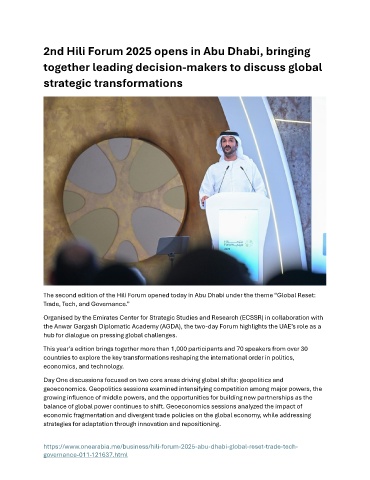 The second edition of the Hili Forum opened today in Abu Dhabi under the theme “Global Reset: