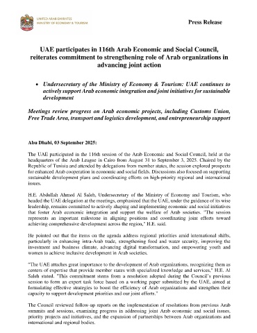 The UAE participated in the 116th session of the Arab Economic and Social Council, held at the