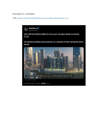 Publication: X – Gulf News Link: Gulf News: UAE GDP hits Dh455 billion in Q1 as non-oil share climbs to historic 77.3%